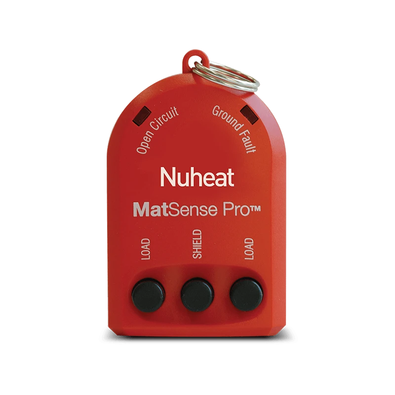 nVent NUHEAT Mat Sense Pro is an electrical fault indicator that simultaneously monitors the hot, neutral and ground wires during your NUHEAT Mat or NUHEAT Cable installation. The MatSense Pro will set off an AUDIBLE alarm when the sensor finds an open circuit or the sensor detects short circuits in the mat. Use an electric fault indicator to ensure a correct NUHEAT installation every time. Simply connect the conductor wires and ground to the MatSense Pro and turn it on. Using the MatSense Pro does not replace the need to test the continuity of the Nuheat mat(s) prior, during and after the installation with a Digital Multi Meter.