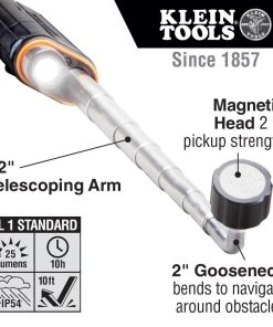 Kleins’ new Telescoping LED Pickup Tool allows you to retrieve any steel tool or part that always seems to drop out of reach. The telescoping arm extends almost two feet, and the gooseneck end allows you to reach around into the tough spots. When you’re in low light, the LED provides light to guide you to your tool and back. The Telescoping Magnetic LED Pickup allows you to reclaim your dropped tools, making this a must-have for your tool bag.
